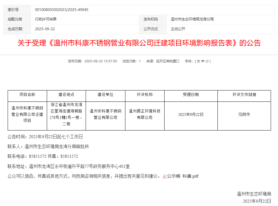 2025年9月22日,溫州市生態(tài)環(huán)境局受理溫州市科康不銹鋼管業(yè)有限公司遷建項目環(huán)境影響報告表并對外進(jìn)行公告,公告期:7個(gè)工作日。